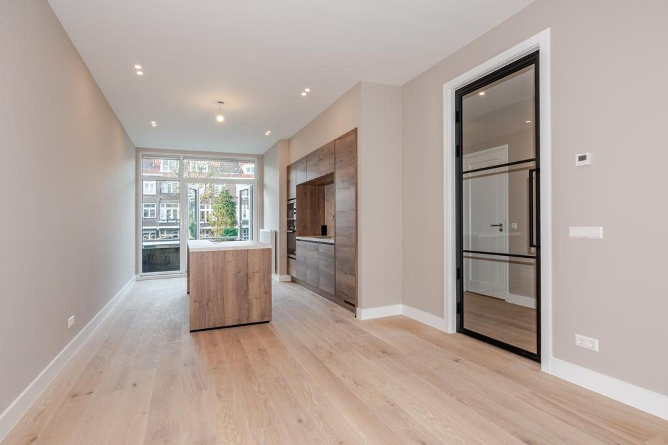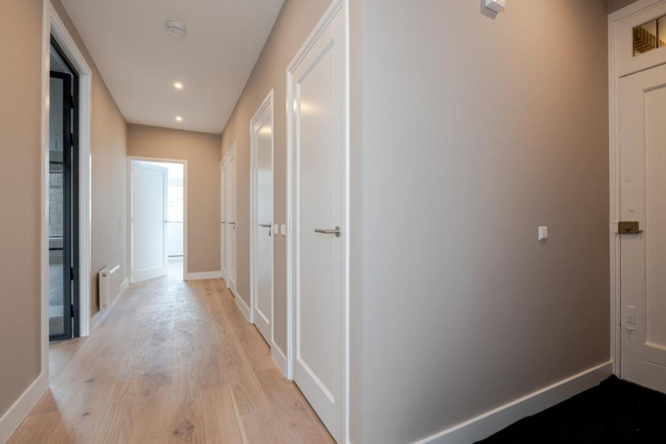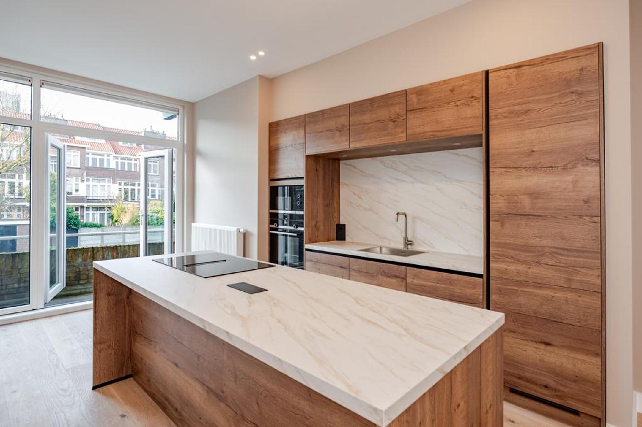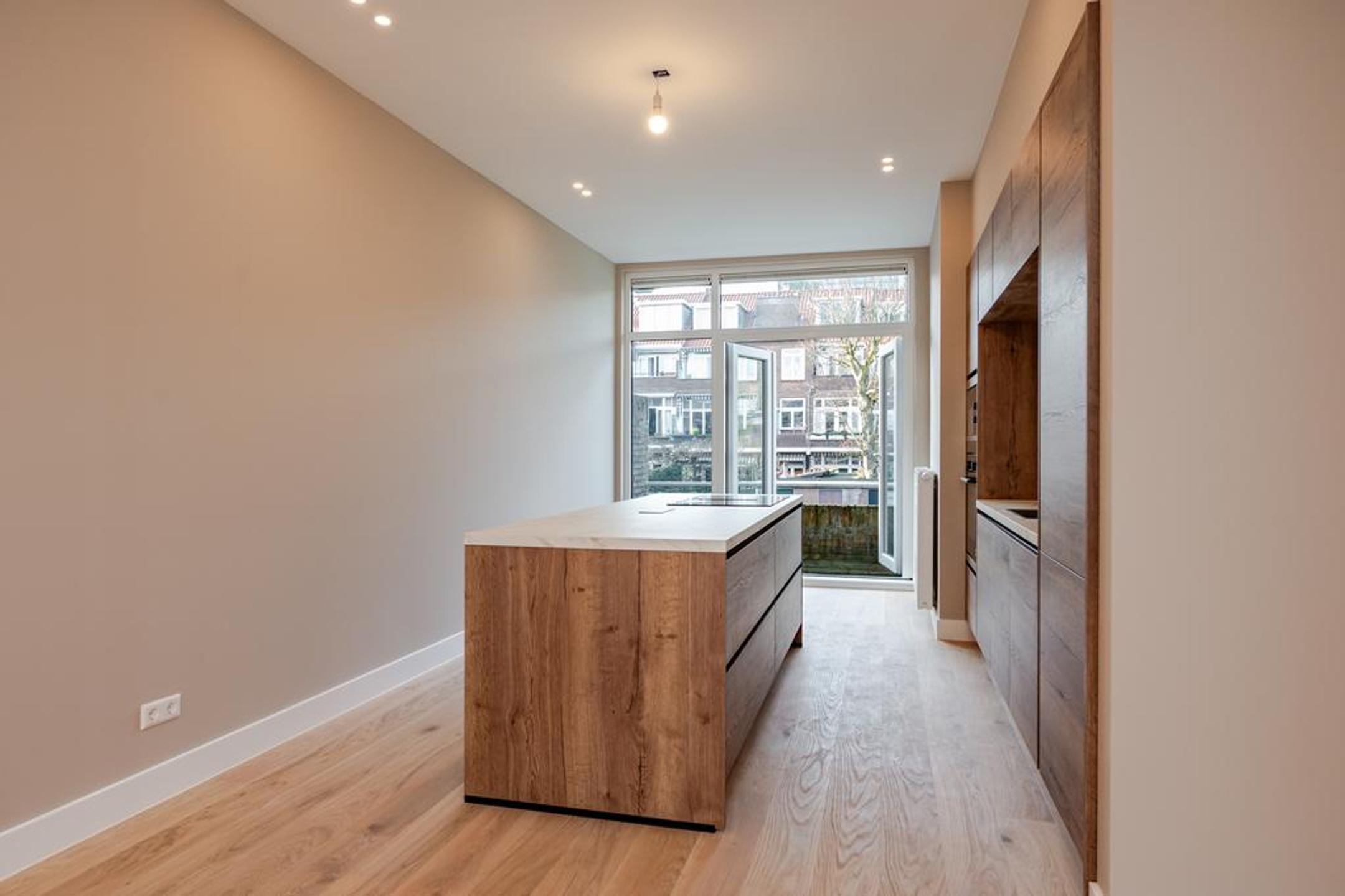 Wij hebben dit royale (ca. 100 m2) volledig high end en met smaak gerenoveerde 4-kamer appartement opgeleverd. Overloop, entree appartement, mooie brede hal met toegang tot alle vertrekken, luxe wc met fonteintje, luxe badkamer met inloopdouche, dubbele wastafel met meubel en designradiator, zonnige woonkamer met openslaande deuren naar het op de ochtendzon gelegen balkon en riante luxe open eetkeuken met eiland en alle inbouwapparatuur.
